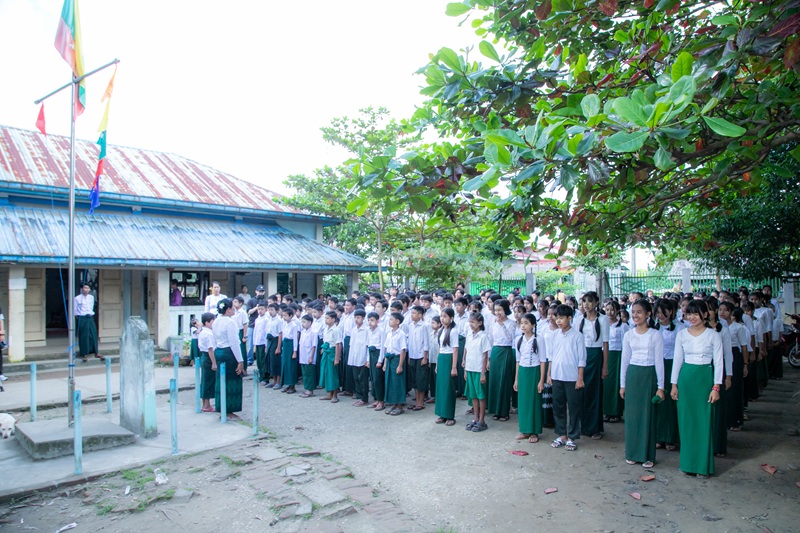 ミャンマーの学校での朝礼の様子