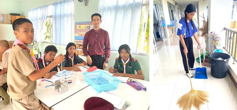 学校では授業がとても楽しいです。特に、国語(タイ語)、理科、社会科が大好きです。これらの授業で新しいことを学び、周りの世界をより深く理解できるようになるからです。休み時間にはクラスメートと学校の様々な活動を楽しんでいます。