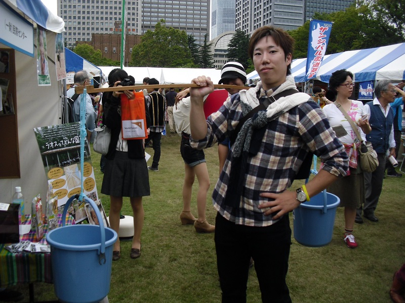 民際センターのブースでは、恒例の100円玉募金活動、水かつぎ体験(ラオスの子どもの日課を体験してもらう)等を行いました。どちらも大好評!!!
