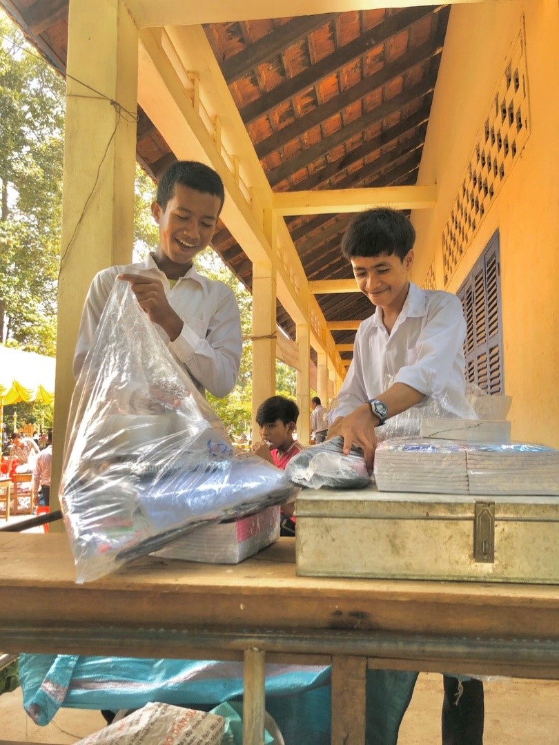 民際センター・カンボジア事務所でインターンに参加している中央大学学生の花堂さんから、皆様からご寄付いただきました奨学金で購入した学用品を贈る授与式(中学校にて実施)の報告がありました。実際の授与式の様子が写真と共にわかりやすく書かれています。また、写真に写る子どもたちの本当に嬉しそうな顔を見ると私たち職員まで幸せな気持ちになります。ご支援いただきました方々、この子どもたちに成り代わりまして、心より御礼申し上げます。