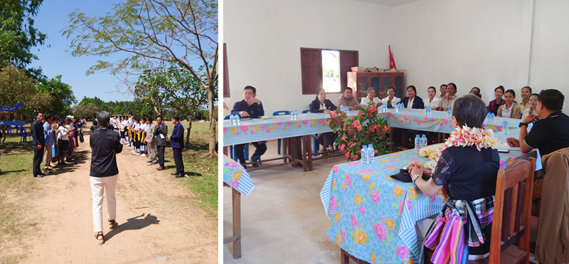 図書館のあるヤンカム小中学校は、サワンナケート県中心部から車で1時間ほどの場所にあります。生徒数は小学校243名、中学校193名。渡辺様が学校に到着すると全校生徒たちが盛大な拍手とともに、国花でもあるプルメリアの生花で作られた首飾りとともに歓迎してくれました。