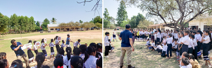 また、渡辺様ご自身が生徒たちに日本語で「おおきなかぶ」を読み聞かせるというお申し出もいただき、良く晴れた校庭で寸劇も交えながら行いました。ジェスチャーやラオ語の解説も交えることで生徒たちもすぐにお話の内容を理解し、劇には生徒たちも参加して大いに盛り上がりました。