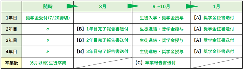 *ご支援中の学生が中途退学した場合は、中途退学の理由をご報告の上、同じ学校の同学年で支援を必要としている学生に翌年以降の奨学金を割り当てさせていただきます。ご了承ください。